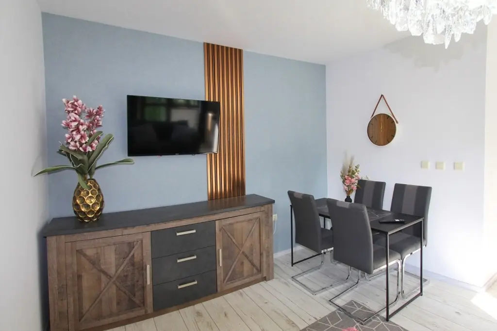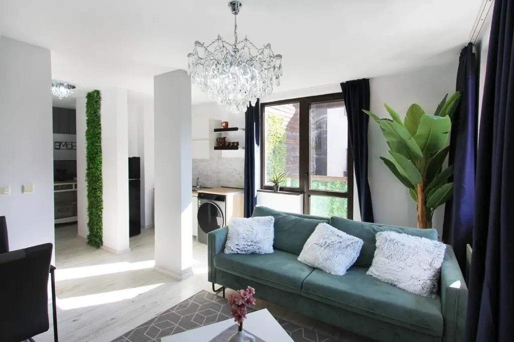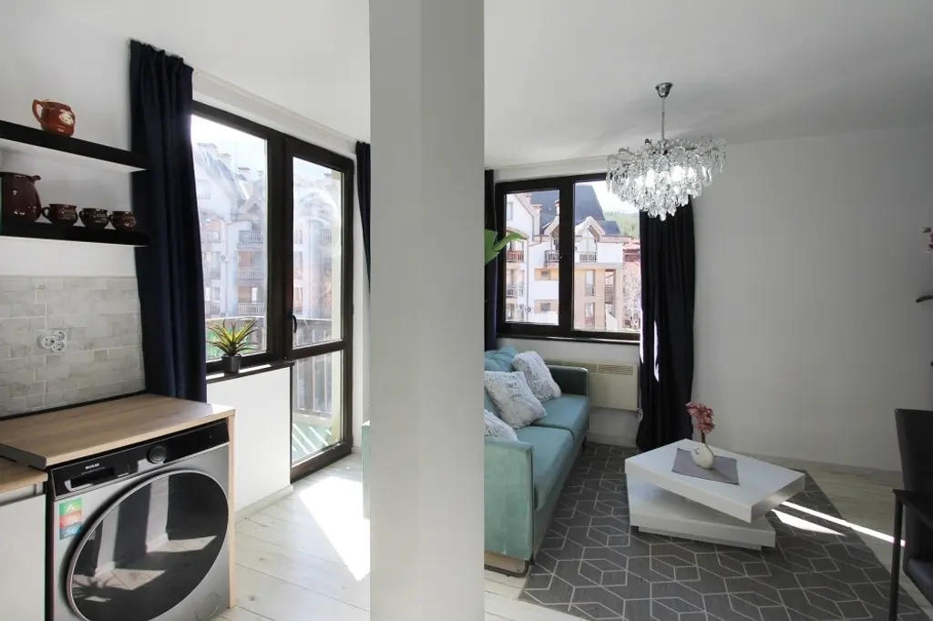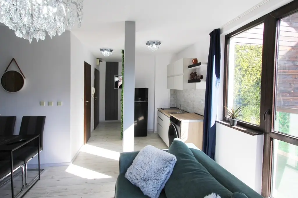 Холът е обзаведен с мека мебел и кухненския кът е оборудван с горни, долни шкафове, хладилник, пералня и ел.котлони. От него се излиза на балкон, който разкрива хубава гледка.