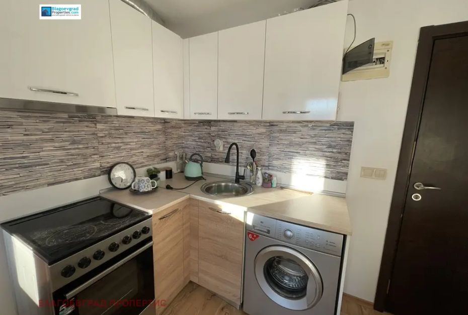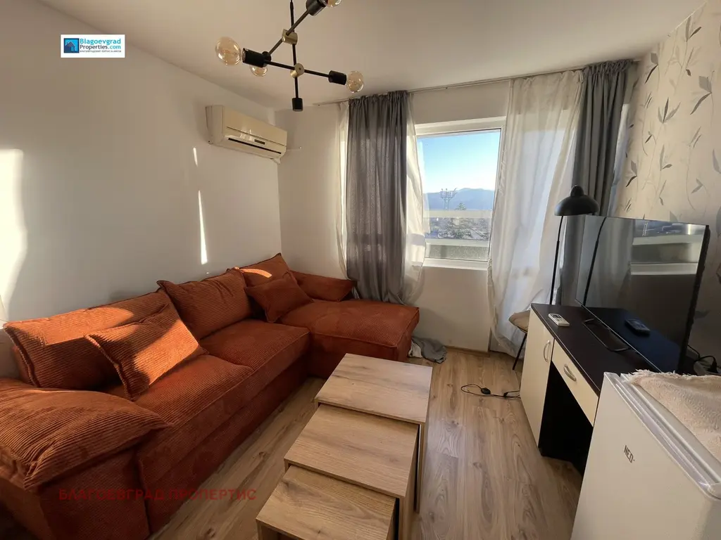 Предлагаме за отдаване под наем, двустаен апартамент, намиращ се в сграда с контролиран достъп, в непосредствена близост до ЛИДЛ, също така в близост до ЮЗУ 'Неофит Рилски' и на 20 мин. пешеходно разстояние от самия център на града. Жилището е разположено на пети /последен / етаж, в сграда с работещ асансьор. Състои се от малка кухня с дневна, спалня със санитарен възел и голяма тераса с излаз от двете стаи. Кухнята разполага с готварска печка, с керамични котлони, горен и долен ред шкафове, вградена пералня, малък хладилник, трапезна маса, голям диван и телевизор . Спалнята е с две отделни легла, които са събрани, има малък гардероб и телевизор. За отоплението и охлаждането има поставени два климатика. Жилището е с изключително слънчево, предвид южното му изложение.