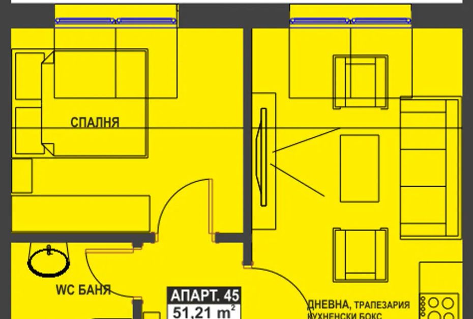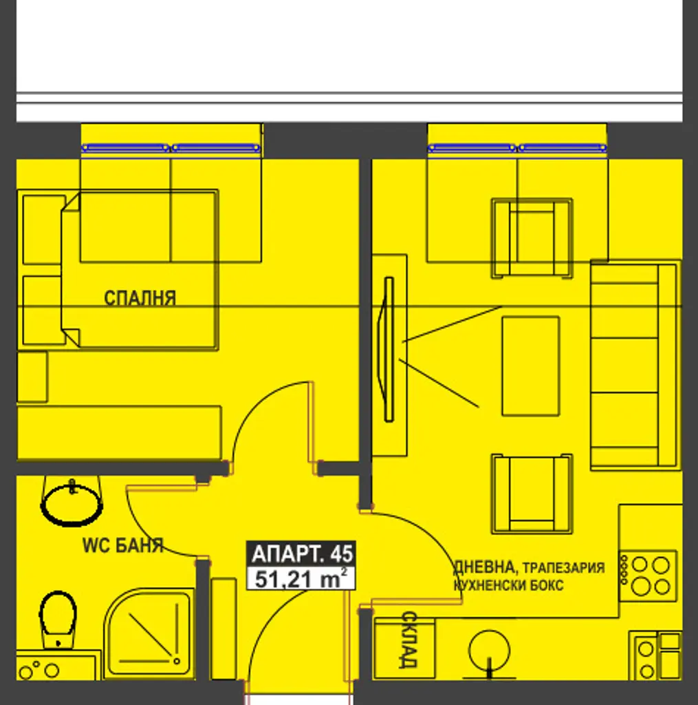 Имотът е ситуиран на 7-ми жилищен етаж и разполага с жилищна площ 54.35кв.м, разгърната в следното разпределение: ходно антре, дневна с трапезария и кухненски бокс, спалня, баня с тоалетна, склад и две тераси.