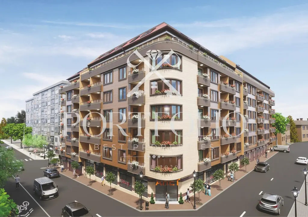 Сградата е с елегантна и модерна архитектура, състояща се от сутеренен етаж с паркоместа, гаражи и складове, партерен етаж с магазини и гаражи и 7 жилищни етажа. Сградата ще бъде изградена с изкючително висок клас материали. Дограмата е петкамерна PVC цвят \'златен дъб\', специална външна мазилка- водоотблъскваща и UV устойчива.Външната облицовка е с естествен камък Травертин на партерен етаж и комбинация от австрийска вентилируема обшивка Верзалит и минерална силиконова мазилка на останалите етажи