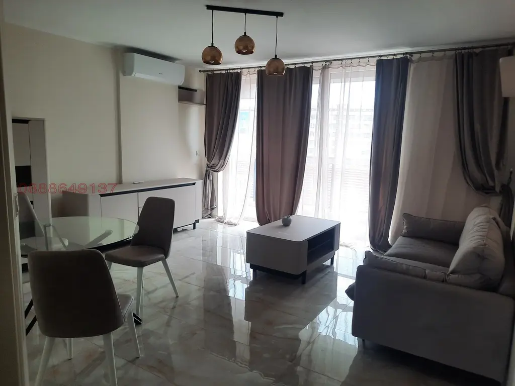 Има следното разположение - входно антре, напълно оборудвана модерна баня с душкабина ,голяма дневна с напълно оборудвана кухня , спалня и тераса с изглед към морето. Апартаментът е с бойлер , пералня и климатик и се продава с наличните мебели и техника, видни от снимките .Жилището е за ценители на модерния градски живот и си заслужава инвестицията.