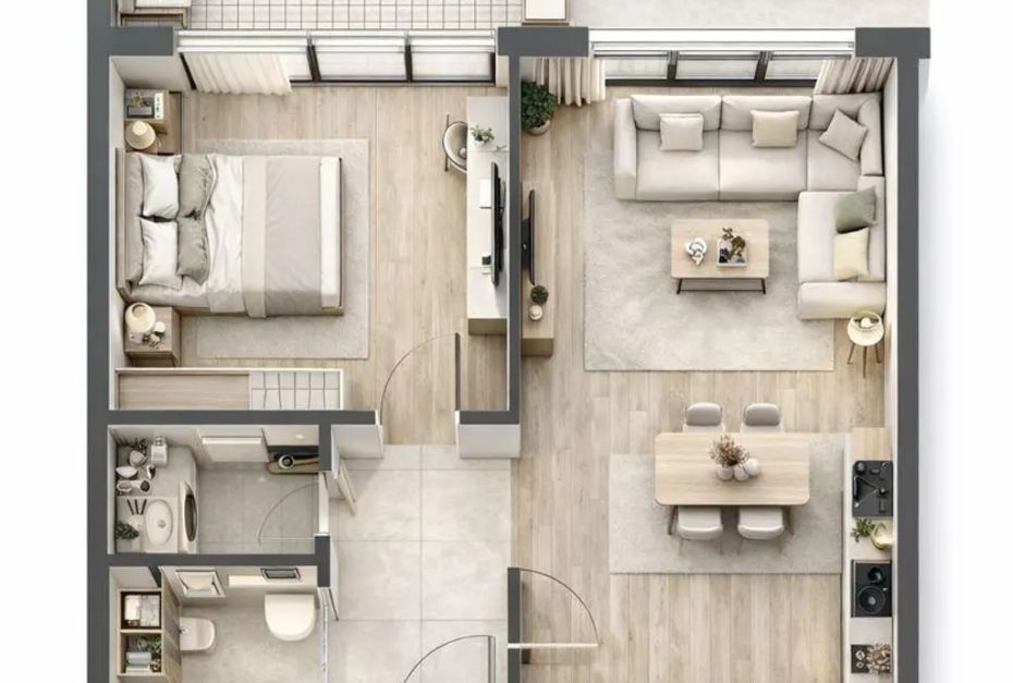 Имота разполага с площ от 80 кв.м., разгърната в следното разпределение: входно антре, хол с бокс кухня, спланя, баня с тоалетна, мокро помещение и тераса.