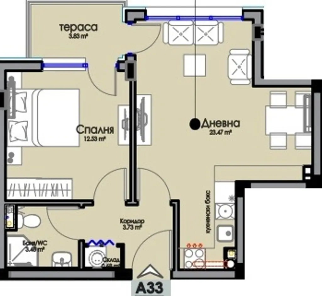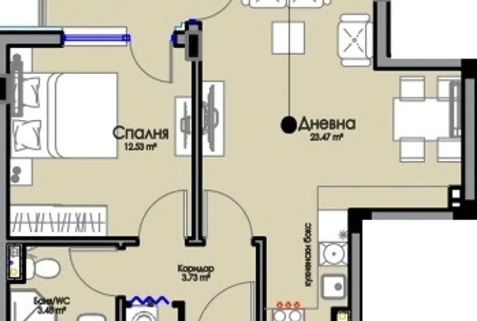 Апартаментът е ситуиран на 4-ти жилищен етаж, с площ от 63,67 кв.м. и има следното практично разпределение: кухня с всекидневна, спалня, баня с тоалетна, тераса.