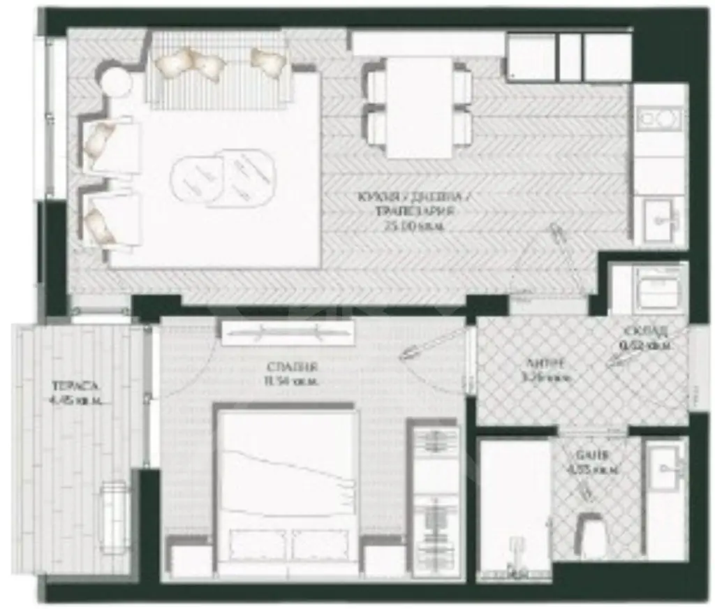 1 спалня, просторен хол с кухненски бокс
