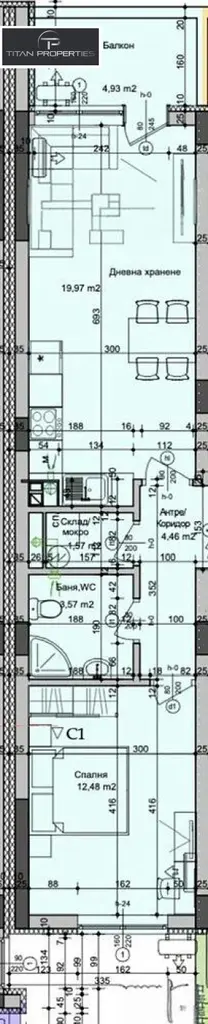 Жилището е ситуирано на 6 ти жилищен етаж, с площ от 63кв.м. и има следното разпределение: входно антре, кухня с хол и тераса към тях, мокро помещение, баня с тоалетна, спалня.