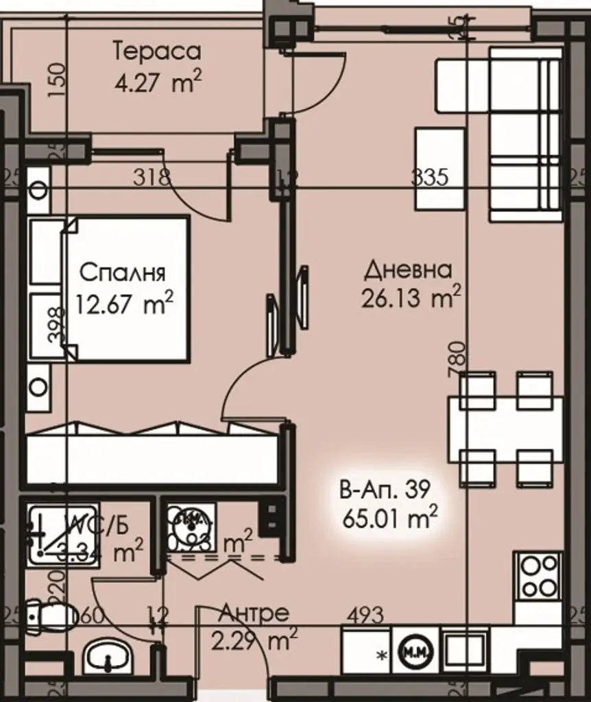 Предлаганият от нас имот е ситуиран на 6-ти жилищен етаж, с площ от 65,01 кв.м. и има следното разпределение: кухня с всекидневна, спалня, баня с тоалетна, склад, тераса.