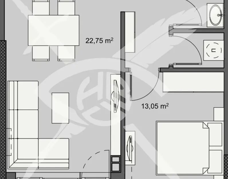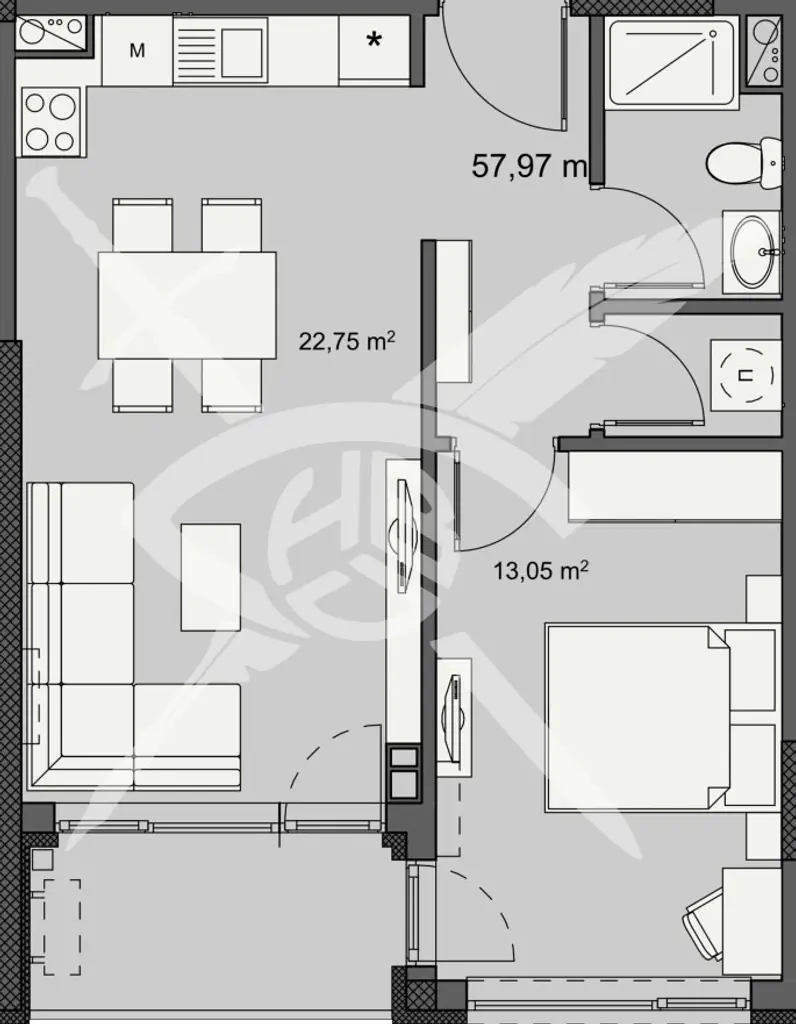 РАПРЕДЕЛЕНИЕ: Апартаментът разполага с площ от 69 кв.м., функционално разпределени в спалня, хол с кухненски бокс, антре и санитарен възел, мокро помещение и тераса.