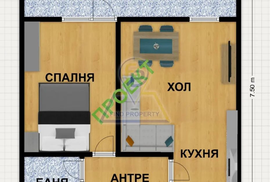 Състои се от 🛋️ всекидневна с голяма тераса, 🍳 отделна кухня, 🛏️ спалня, 🚿 баня с тоалетна и антре.