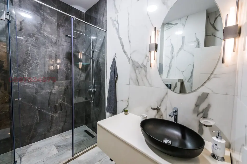 Апартаментьт и гаражьт се продават заедно. Апартаментьт е двустаен, състои се от спалня, просторна всекидневна с кухня и санитарно помещение, с площ 69.25 кв.м. Модерно, комфортно и функционално обзавеждане, с првокласни домакински електроуреди. Нова дограма и външни ролетни щори. Разполага с два отделни входа. Напълно обзаведен, възможно нанасяне веднага. Гаражьт се намира непосредствено до апартамента, с ролетна гаражна врата и ел. задвижване, с площ 18,26 кв.м! Апартаментьт и гаражьт се продават заедно..