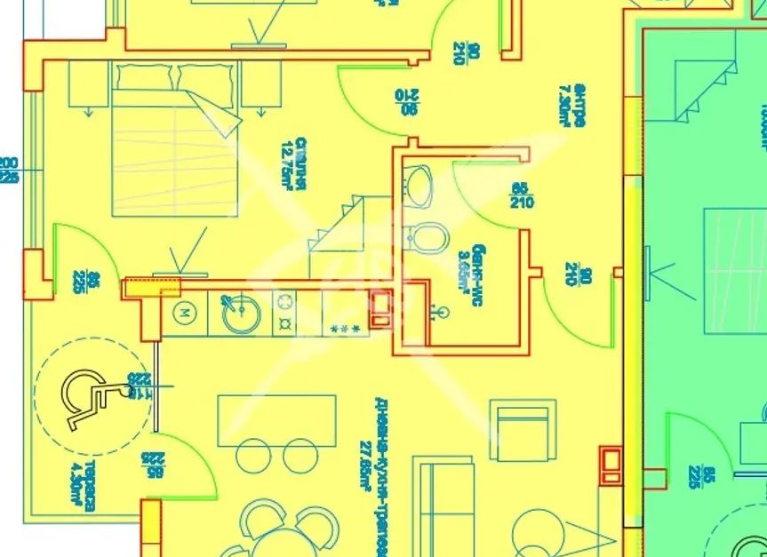 РАЗПРЕДЕЛЕНИЕ: Жилището разполага с площ 66,84 кв.м., състои се от хол с кухня, спалня и баня с тоалетна.
