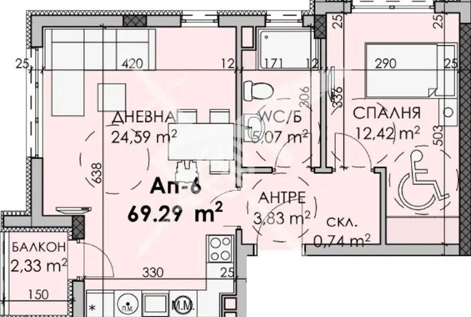 РАЗПРЕДЕЛЕНИЕ: Жилището разполага с площ 69,29 кв.м., състои се от хол с кухня, спалня и баня с тоалетна.