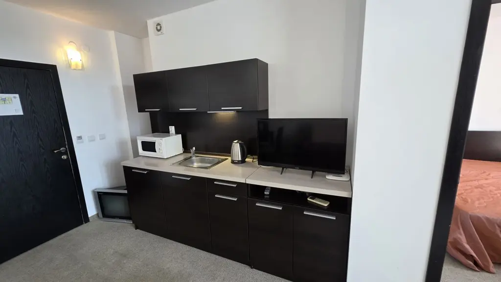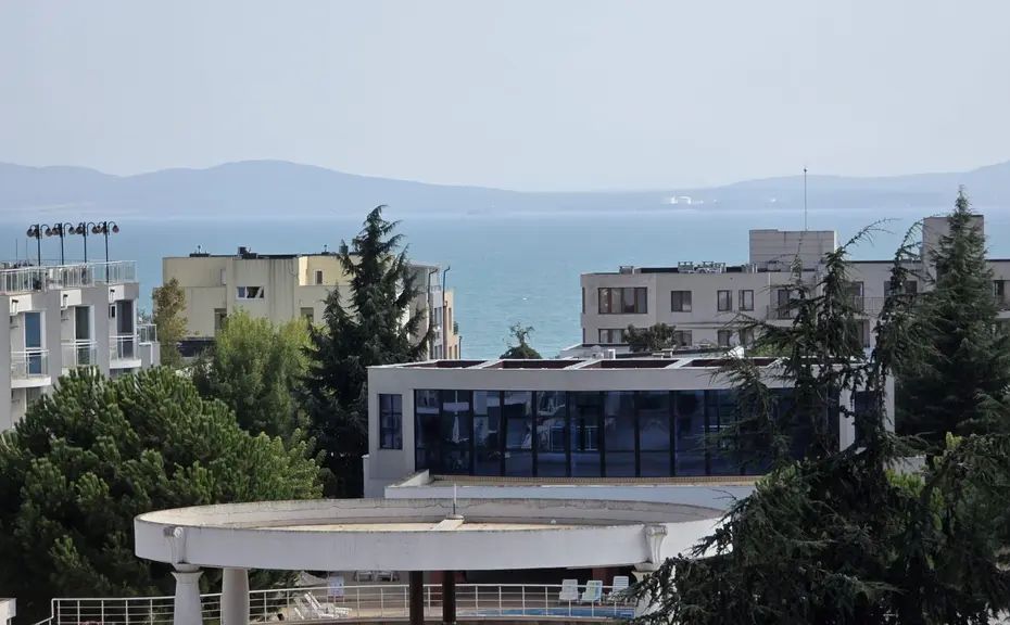 Продава се панорамен двустаен апартамент в комплекс АТЛАНТИС, квартал Сарафово - Бургас. Гледка към морето и басейн от двете стаи.