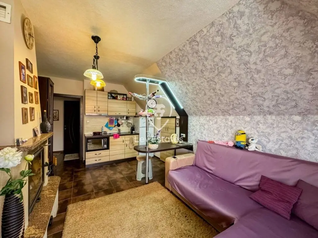 Удобно разпределение с отделно входно антре, голяма остъклена лоджия. Просторна дневна с оборудвана кухня, бар за закуска, кът за сядане и камина. Благоприятна спалня. Всяка стая разполага с климатик. Баня с душ.