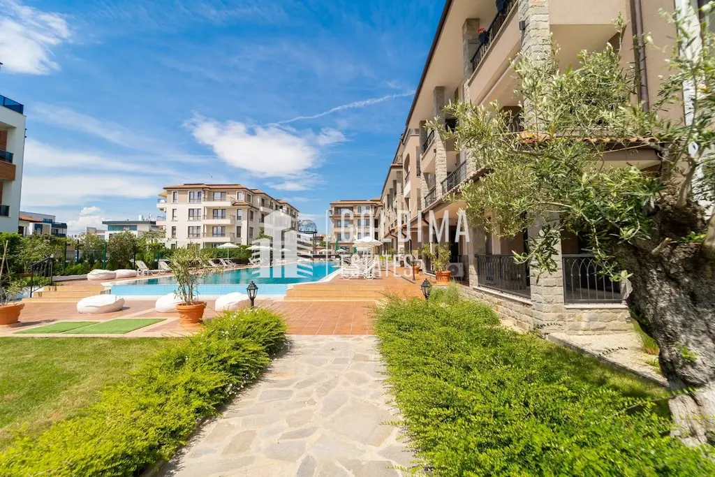 Намира се на втори етаж от четириетажна сграда в затворен комплекс, разполагащ с: басейн, ресторант, фитнес, рецепция и охрана. В район с добре изградена инфраструктура, на първа линия море и в непосредствена близост до редица удобства и развлечения.
