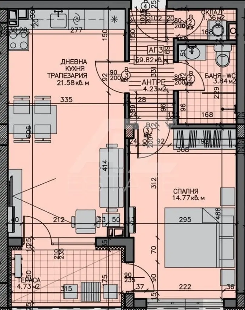 Апартаментът се състои от антре, складово помещение, баня с тоалетна, дневна кухня трапезария, спалня и тераса.
