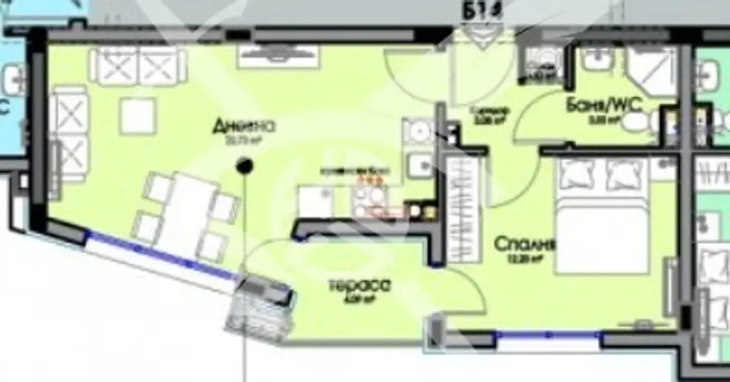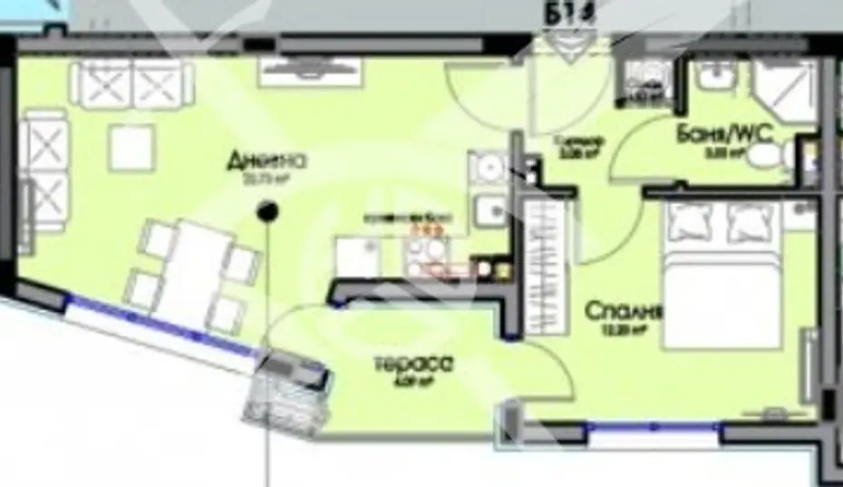 РАЗПРЕДЕЛЕНИЕ: Жилището разполага с площ 62,17 кв.м., състои се от хол с кухня, спалня и баня с тоалетна.