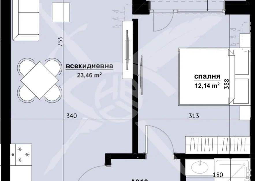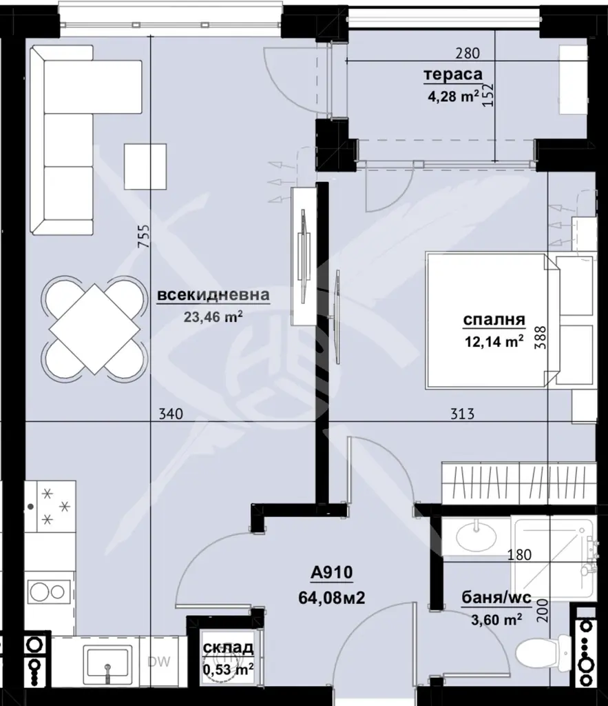 РАЗПРЕДЕЛЕНИЕ: Жилището разполага с площ 64,08 кв.м., състои се от хол с кухня, спалня и баня с тоалетна.