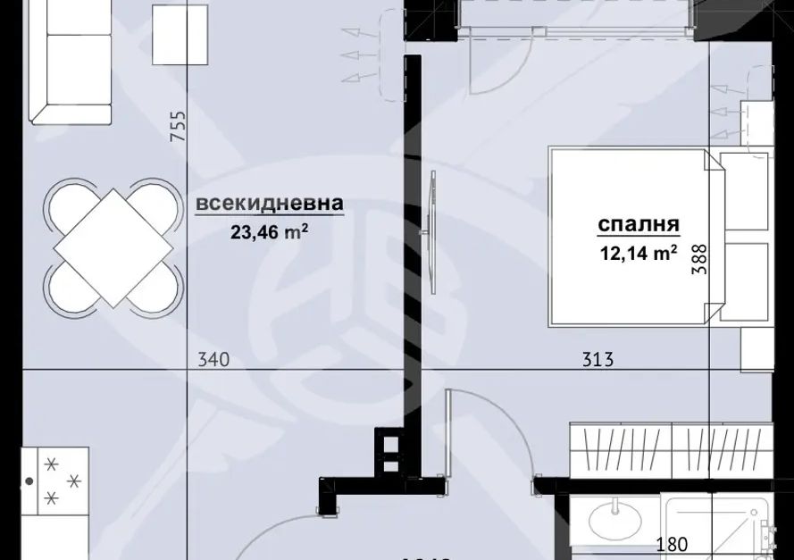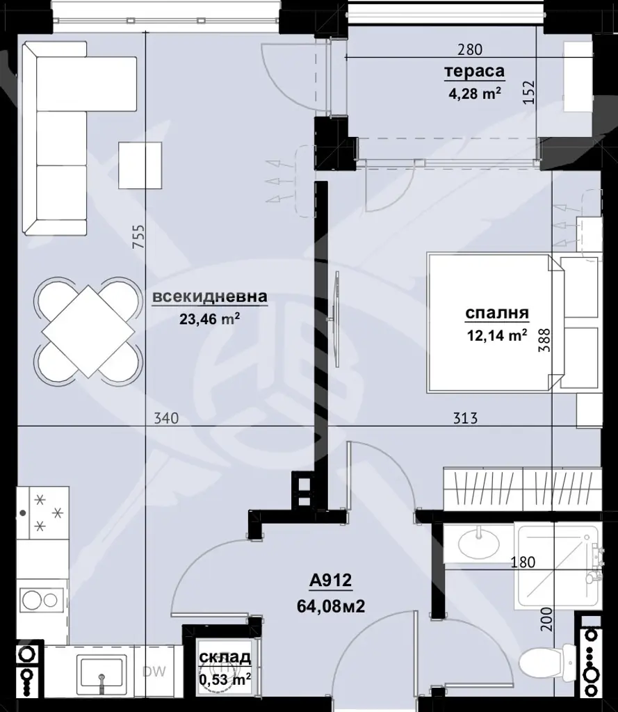 РАЗПРЕДЕЛЕНИЕ: Жилището разполага с площ 64,08 кв.м., състои се от хол с кухня, спалня и баня с тоалетна.