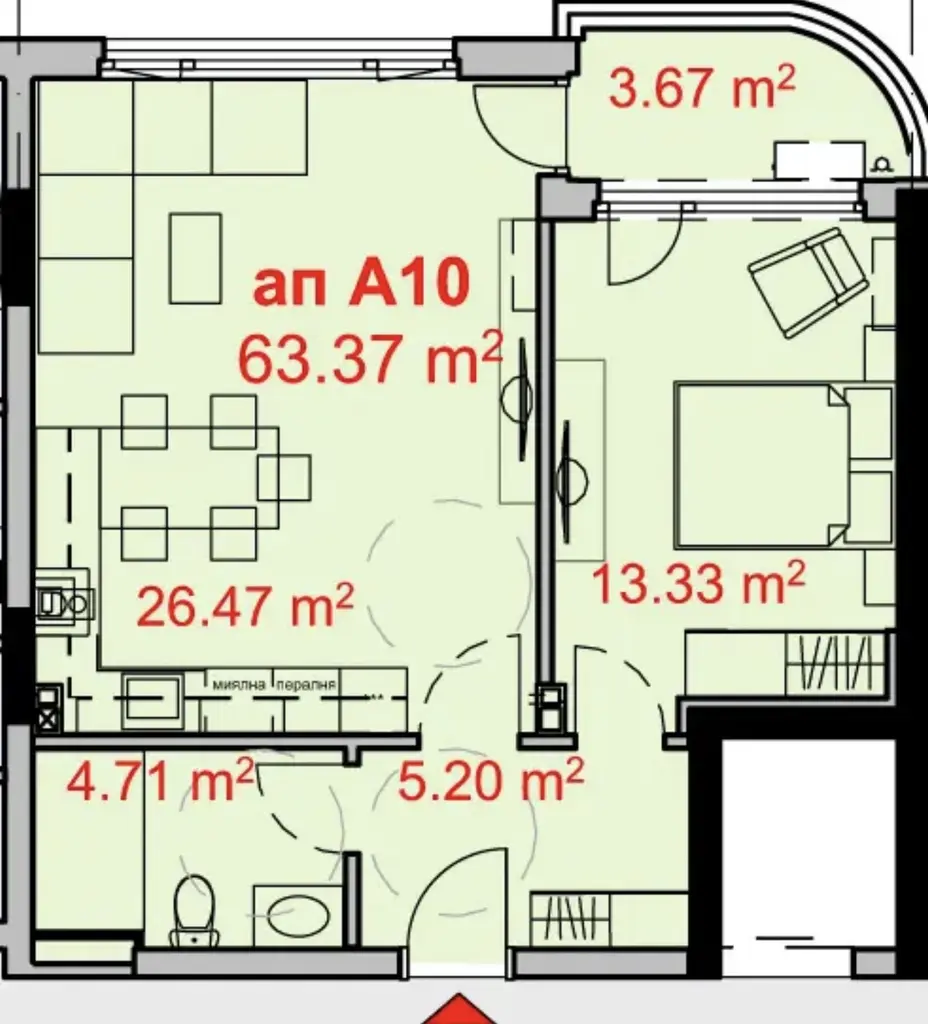 Апартаментът е с площ от 75 кв.м и включва антре, баня с тоалетна, спалня и всекидневна с кухня, която води към тераса. Разпределението е функционално и осигурява комфортно ежедневие.