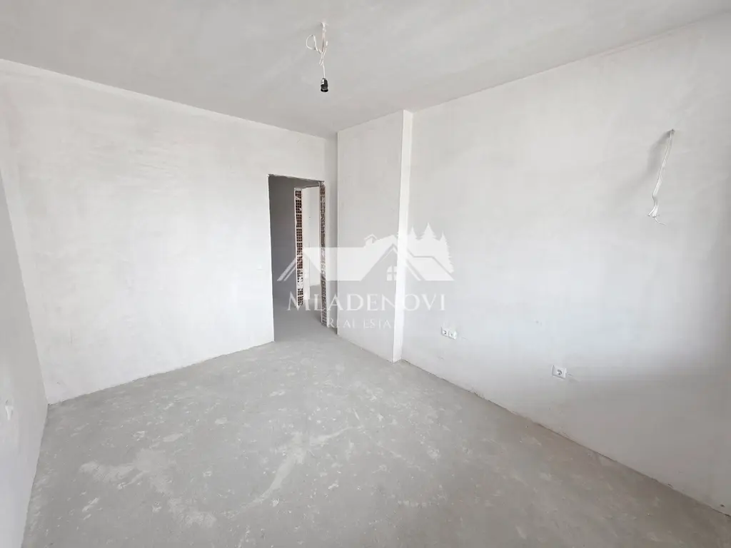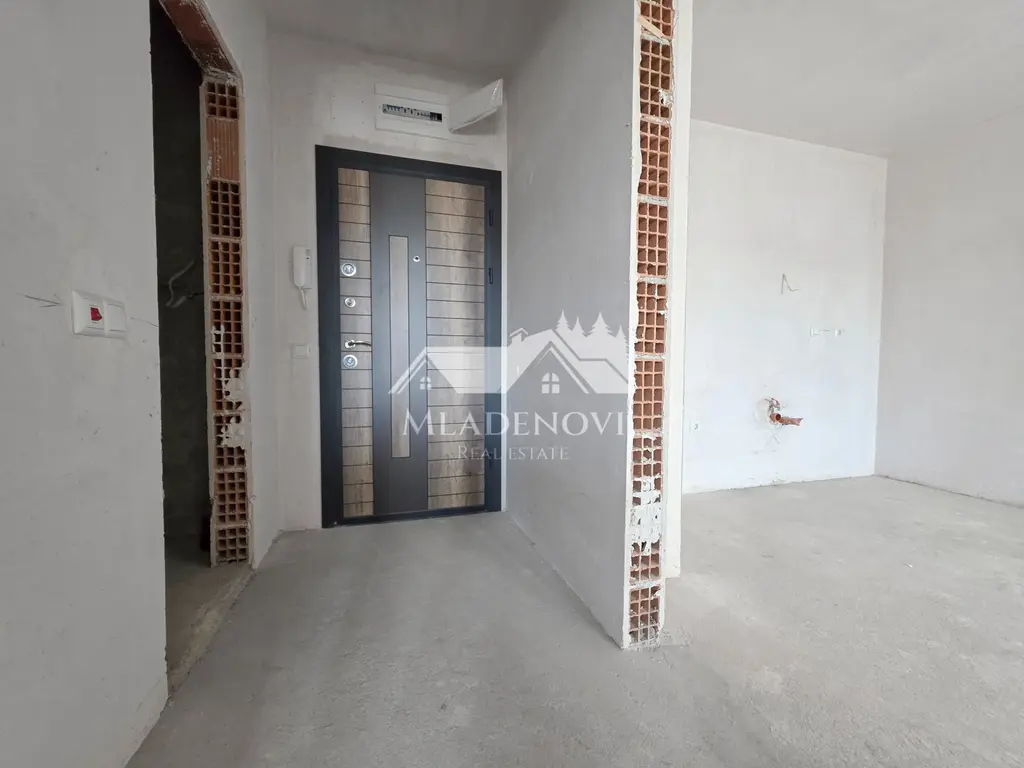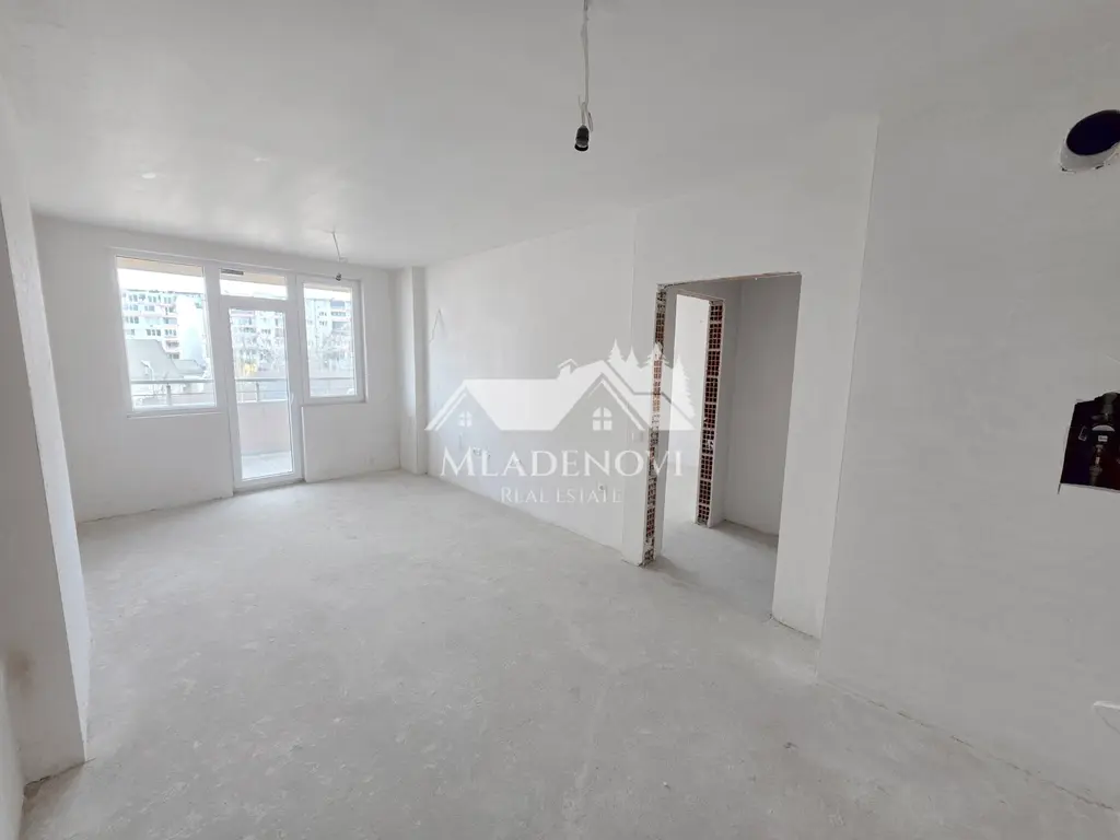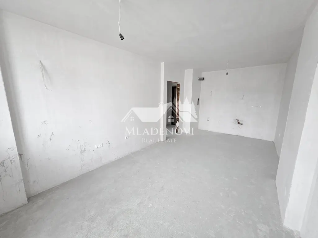 Сградата е нова, монолитна, с асансьор и контрол на достъпа, построена през 2025 г., с тухлено строителство и акт 16. Апартаментът е в степен на завършеност на тапа.
