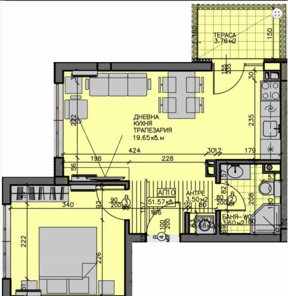 Разпределение: просторна всекидневна с кухня и трапезария, комфортна спалня, баня с тоалетна и тераса.