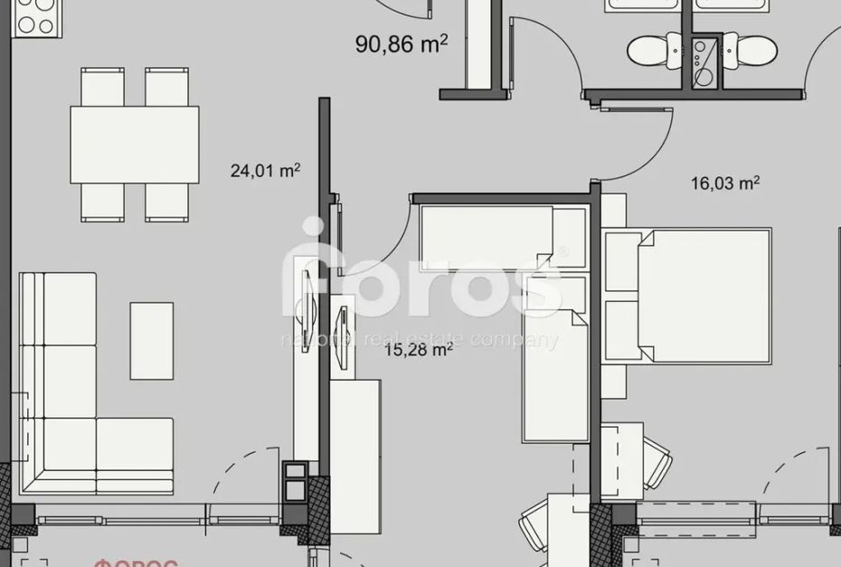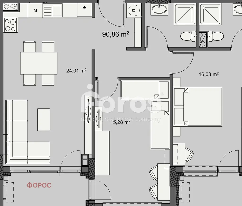 Холът е с площ от 24.01 кв.м., спалните са с площ от 15.28 кв.м. и 16.03 кв.м.