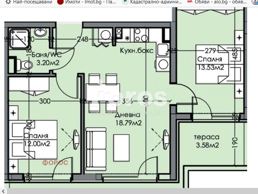 Холът е с площ от 18.79 кв.м., спалните - с площ от 12.00 кв.м. и 13.53 кв.м, баня- 3.20 кв.м, две тераси с площ от 3.58 кв.м и 12.94 кв.м