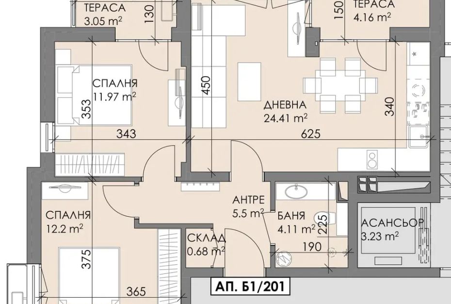 Сградата е с монолитна стоманобетонна конструкция. Апартаментите ще бъдат завършени по БДС: