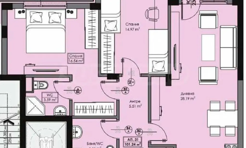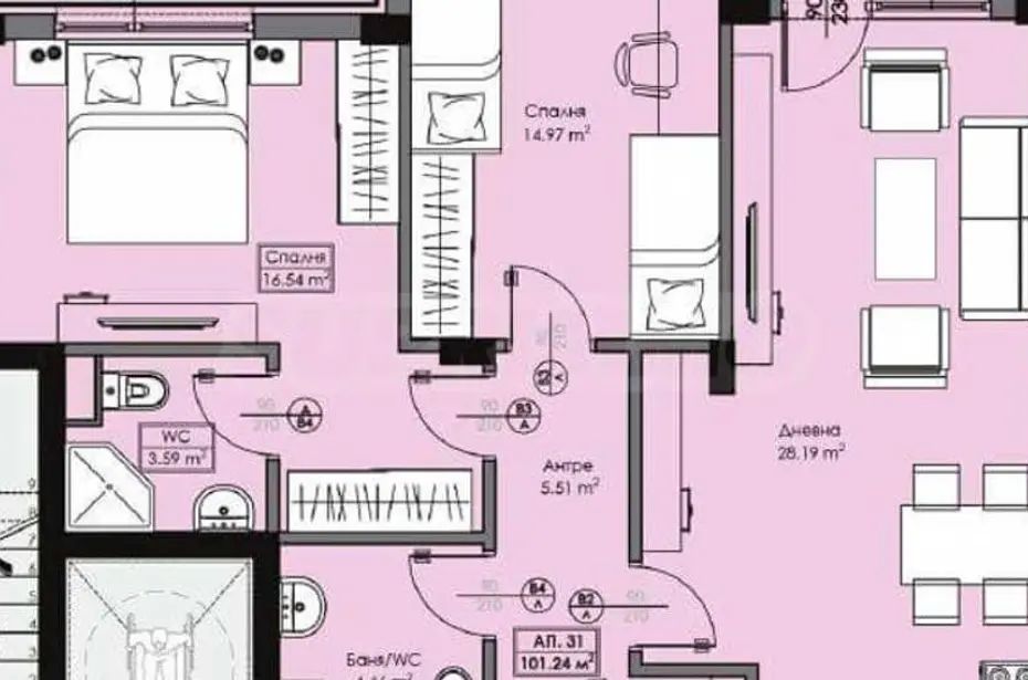 Имотът е с обща площ от 101,33 кв.м, разположен на 3-ти етаж.