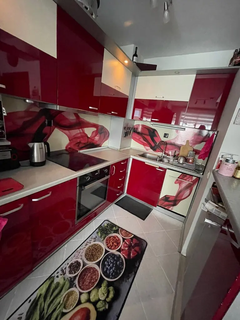 Имотът е разположен на 2ри жилищен етаж и разполага с площ от 105 кв.м, разгърнати в следното практично разпределение:коридор, просторна и функционална всекидневна с модерна кухня, напълно оборудвана с всички необходими електроуреди, две спални, , две бани с WC и две тераси идеални за вашите сутрешни кафета или вечерни релаксации.
