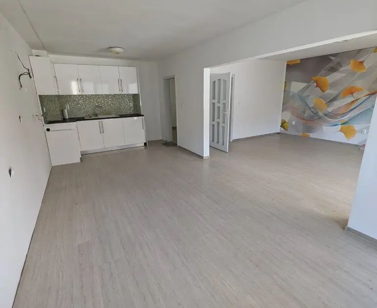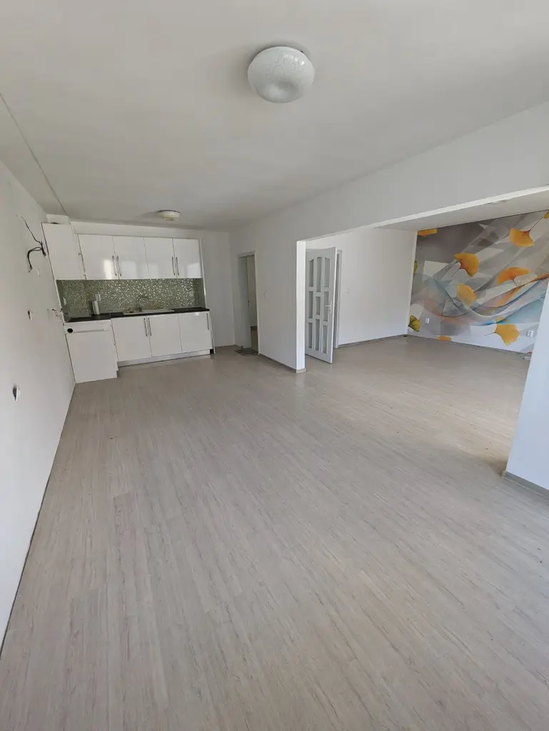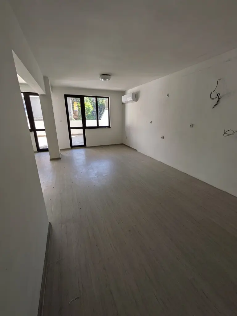 РАЗПРЕДЕЛЕНИЕ: голямо входно антре, просторен хол с кухня с голяма тераса на изток, баня, отделна тоалетна, две западни спани. С изба 10 кв.м. и земя към имота 60 кв.м..