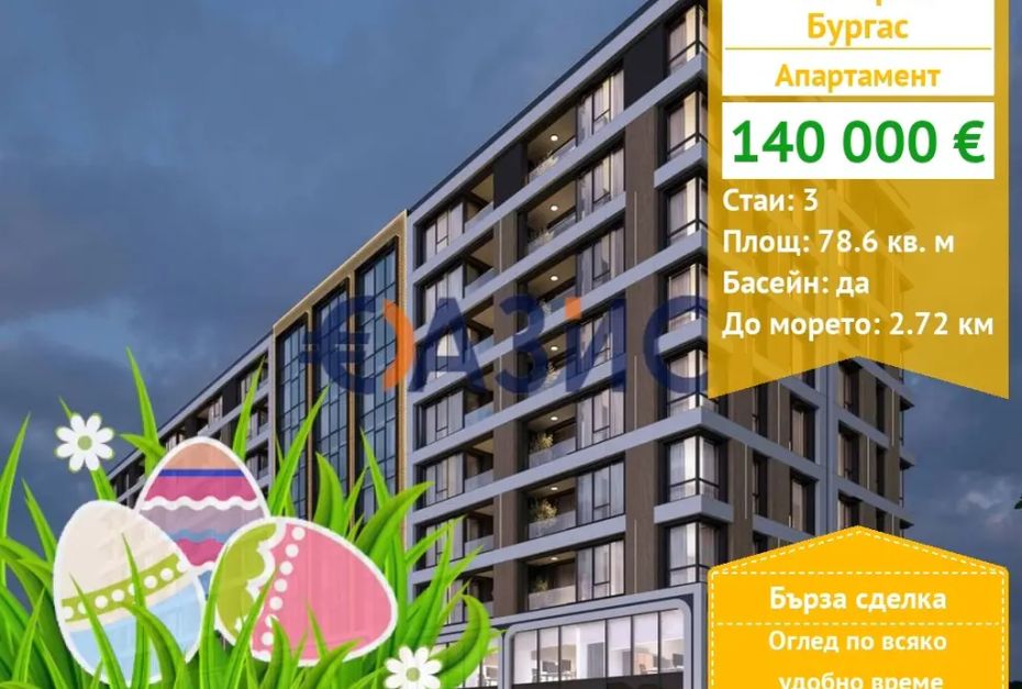 Предлаганият имот е тристаен апартамент в комплекс Смокините 4, разположен в град Бургас, кв. Хоризонт. Разполага с обща площ от 79 кв.м и е на 6-ти етаж от 9. Вътрешното разпределение включва две спални и дневна зона с естествено осветление. Сградата е с тухлено строителство, в процес на изграждане (2028), с две секции и два високоскоростни асансьора. В комплекса са предвидени фитнес зала, спа зона, зелени площи и паркоместа. Локацията е в близост до центъра на града, с удобен достъп до градската инфраструктура. Имотът е подходящ за хора, търсещи съвременен градски живот с допълнителни удобства в затворен комплекс.
