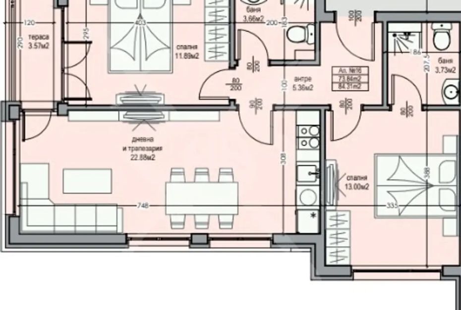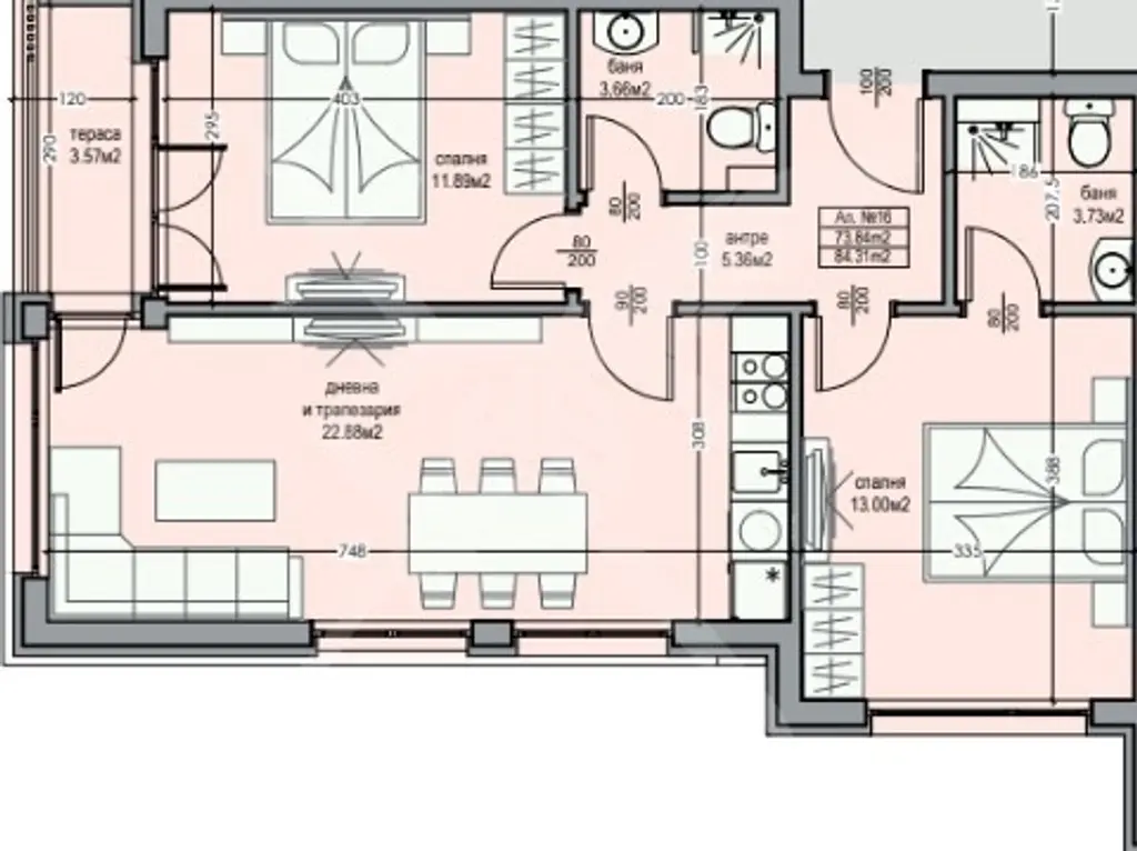 РАЗПРЕДЕЛЕНИЕ: Жилището разполага с площ 84кв.м., състои се от хол с кухненски бокс, две спални, две бани с тоалетна и тераса.