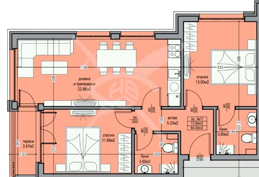РАЗПРЕДЕЛЕНИЕ: Жилището разполага с площ 85кв.м., състои се от хол с куненски бокс, две спални, две бани с тоалетна и тераса.