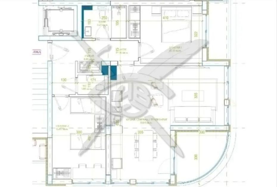 РАЗПРЕДЕЛЕНИЕ: Апартаментът разполага с площ от 107 кв.м, функционално разпределени в коридор, баня с тоалетна, втора тоалетна, дрешник /склад, две спални, всекидневна с кухненски бокс и тераса.