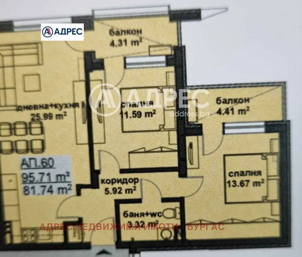 Тристаен апартамент в новоизградена тухлена сграда. Състои се от хол с кухненска част и прилежаща тераса, две спални с прилежащи тераси, коридор, санитарно помещение и склад.