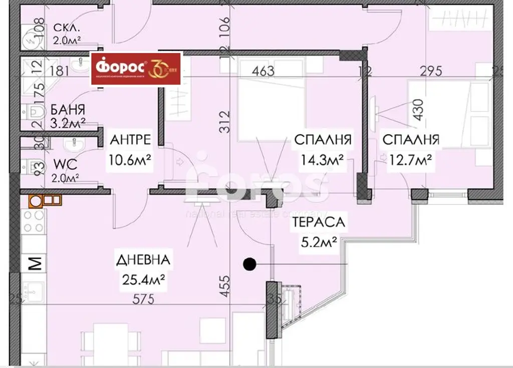 Спалните са с площ от 14.3 кв.м. и 12.7 кв.м., холът - с площ от 25.4 кв.м., санитарни възли - 3.21 кв.м. и 2 кв.м., склад - 2 кв.м., тераса - 5.2 кв.м.