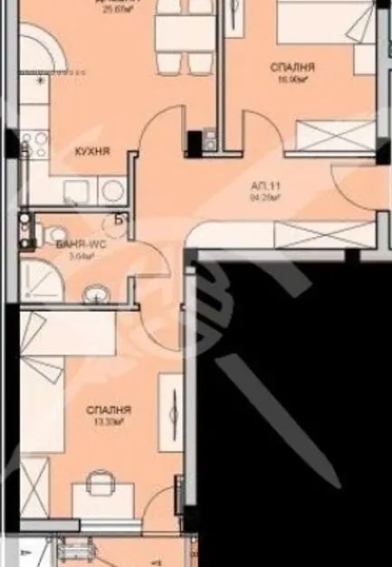 РАЗПРЕДЕЛЕНИЕ: Жилището разполага с площ 116,15 кв.м., състои се от хол с кухня, 2 спални и баня с тоалетна.