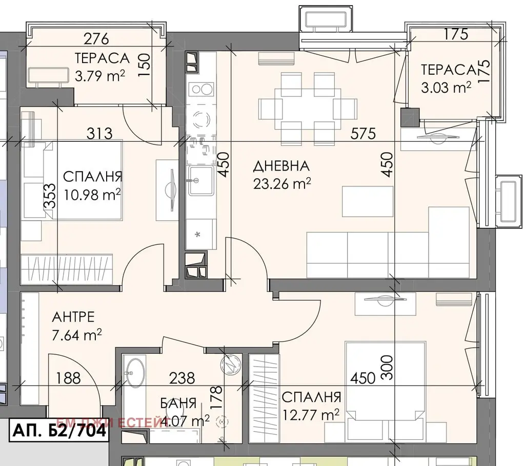 Жилището се състои от просторна всекидневна с кухненска част, две големи спални, баня с тоалетна, склад и две тераси.