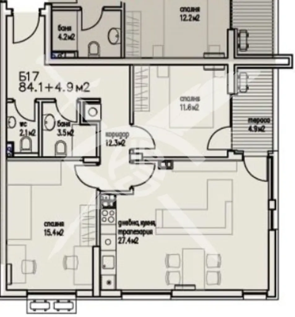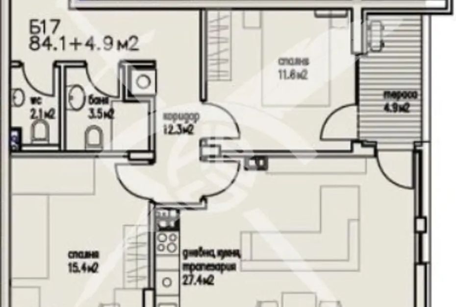 РАЗПРЕДЕЛЕНИЕ: Разполага с площ от 103 кв.м., разгърната в следното функционално разпределение: кухненски бокс хол,две спални, баня с тоалетна, тераса.
