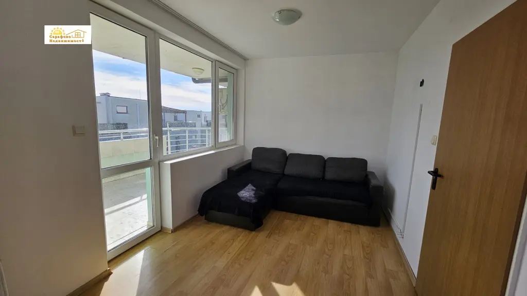 Апартаментът се намира в град Бургас, квартал Сарафово, в затворен комплекс. Разполага с дневна с кухня, две спални, две бани с тоалетни, коридор и две тераси с частична гледка към морето. Жилището е на трети етаж от три, с изложение югозапад. Сградата е от тухлено строителство, построена през 2006 г., с акт 16 и поддръжка от 12 евро на квадратен метър. Локацията е спокойна, в близост до морето и с удобен достъп до градската инфраструктура. Имотът е подходящ за семейно живеене с акцент върху сигурността и удобствата на затворен комплекс.