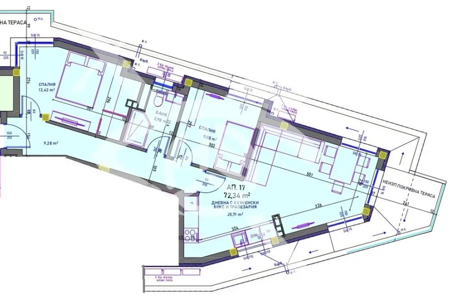 РАЗПРЕДЕЛЕНИЕ: Жилището разполага с площ 129,11 кв.м., състои се от хол с кухня, две спални, баня с тоалетна и тераса.