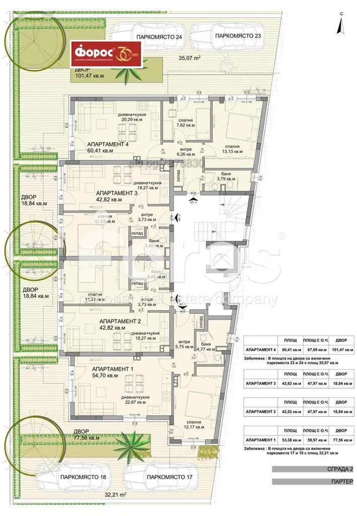 Жилището се намира на ПАРТЕР, с чиста площ от 85 кв.м., общи части 5 кв.м., две паркоместа с площ от 35 кв.м. и двор с площ от 41 кв.м.