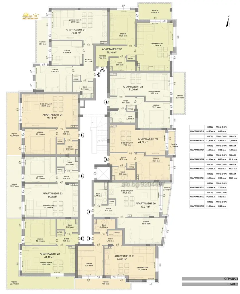 Ап.31 е в сграда 3 на трети жилищен етаж със западно изложение(виж снимката с етажният план).