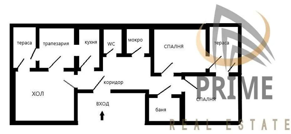 РАЗПРЕДЕЛЕНИЕ: Коридор, кухня, трапезария, хол /могат да се обединят в едно/, две спални, баня, отделна тоалетна, мокро помешение и две тераси.