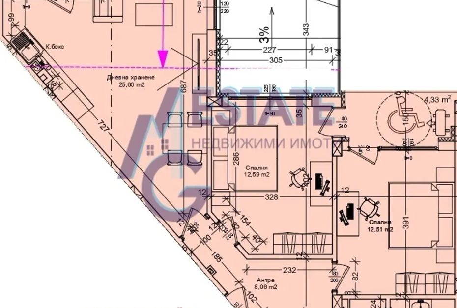 Ем Джи Естейт продава тристаен апартамент с площ 114,32 m2, разположен на етаж втори, състои се от всекидневна с кухня и трапезария, две спални, баня с тоалетна, склад, две тераси.