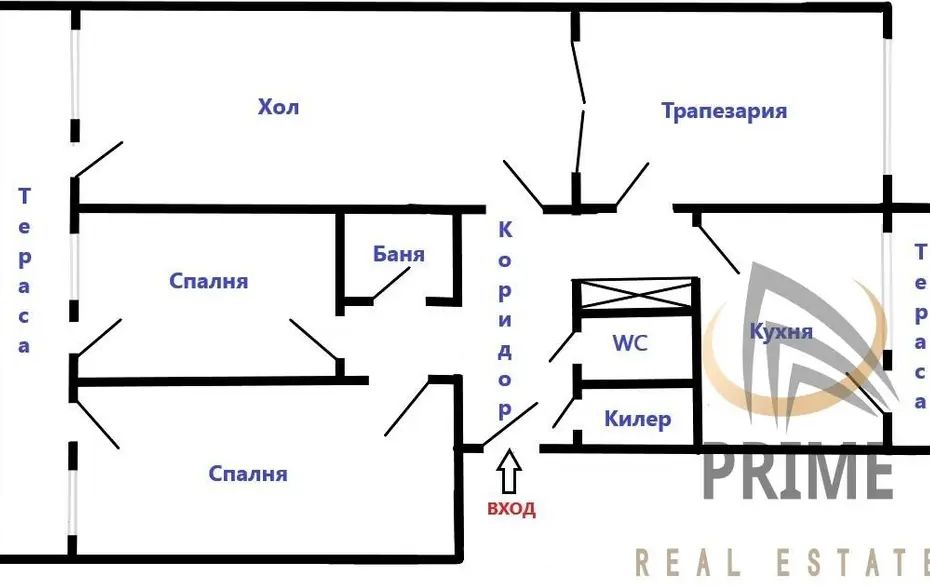 РАЗПРЕДЕЛЕНИЕ: коридор, кухня с трапезария и хол /възможност за трета спалня/, две спални, два санитарни възела, мокро помещение, две тераси.