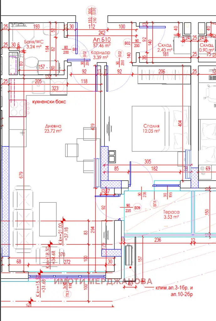 Апартаментът се намира на етаж 3 с югозападно изложение. Чистата застроена площ е 58 кв.м и се състои от всекидневна с кухненски бокс, антре, баня с тоалетна, спалня, тераса.