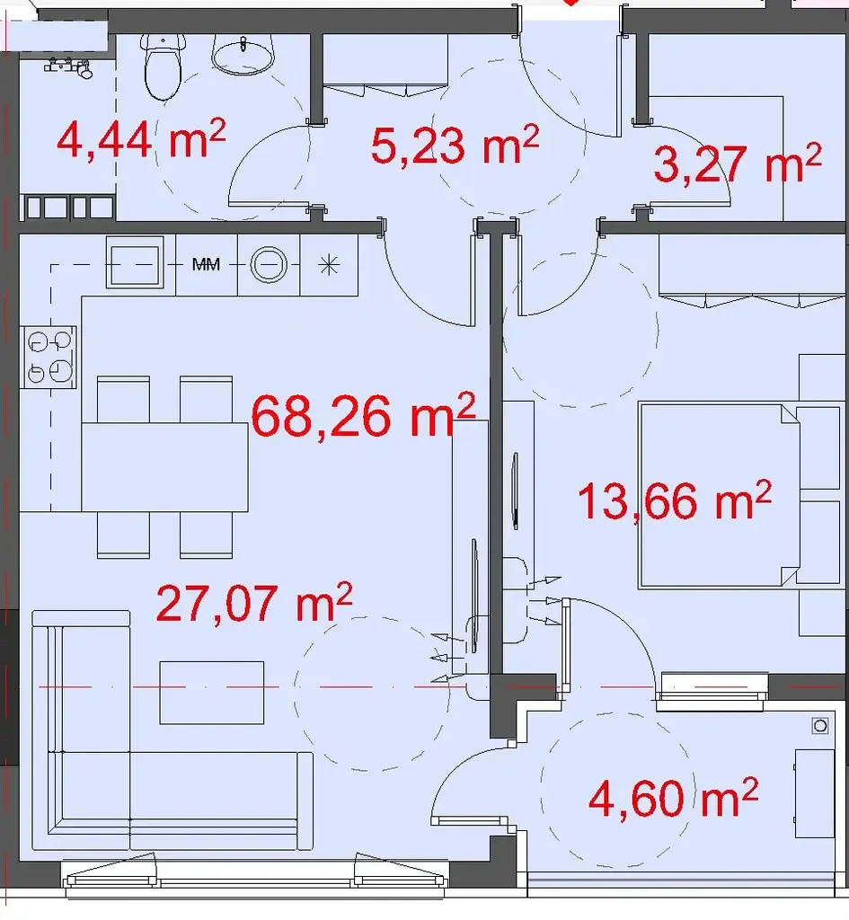 Жилището е със следното разпределение просторна дневна от 27 кв.м с отворен план кухня, мокро пмещение, 14 кв.м спални , баня с тоалетна, тераса и входно антре. Изложението е юг.