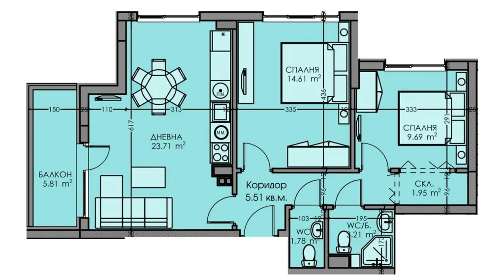 Разполага с площ от 86 кв.м. и има следното практично разпределение: коридор, 2 спални, хол с бокс кухня, баня с тоалетна, отделна тоалетна, тераса към хола